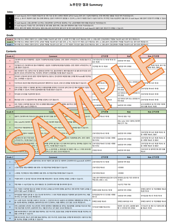 회사의 현재 인사노무제도, 실무 practice를 근거로 잠재적인 법적 risk를 진단해 드리는 서비스인데요. 회사에서는 전혀 인지하지 못했던 잠재적인 risk를 확인하거나, 초기부터 확실하게 시스템을 만들어 나갈 수 있어 실제 만족도도 매우 높은 편입니다.